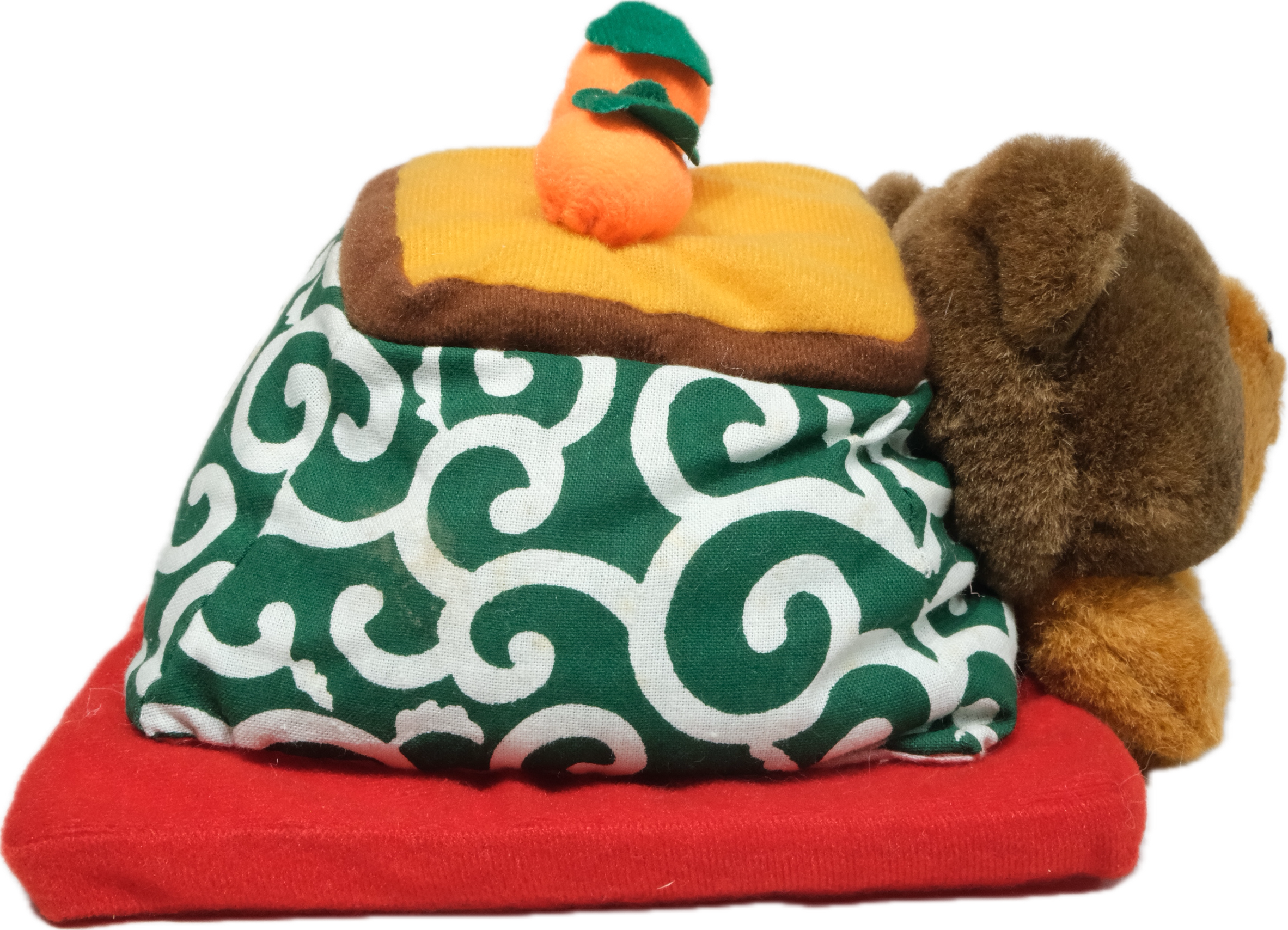 すこし古い、コタツに入ったクマのぬいぐるみです。