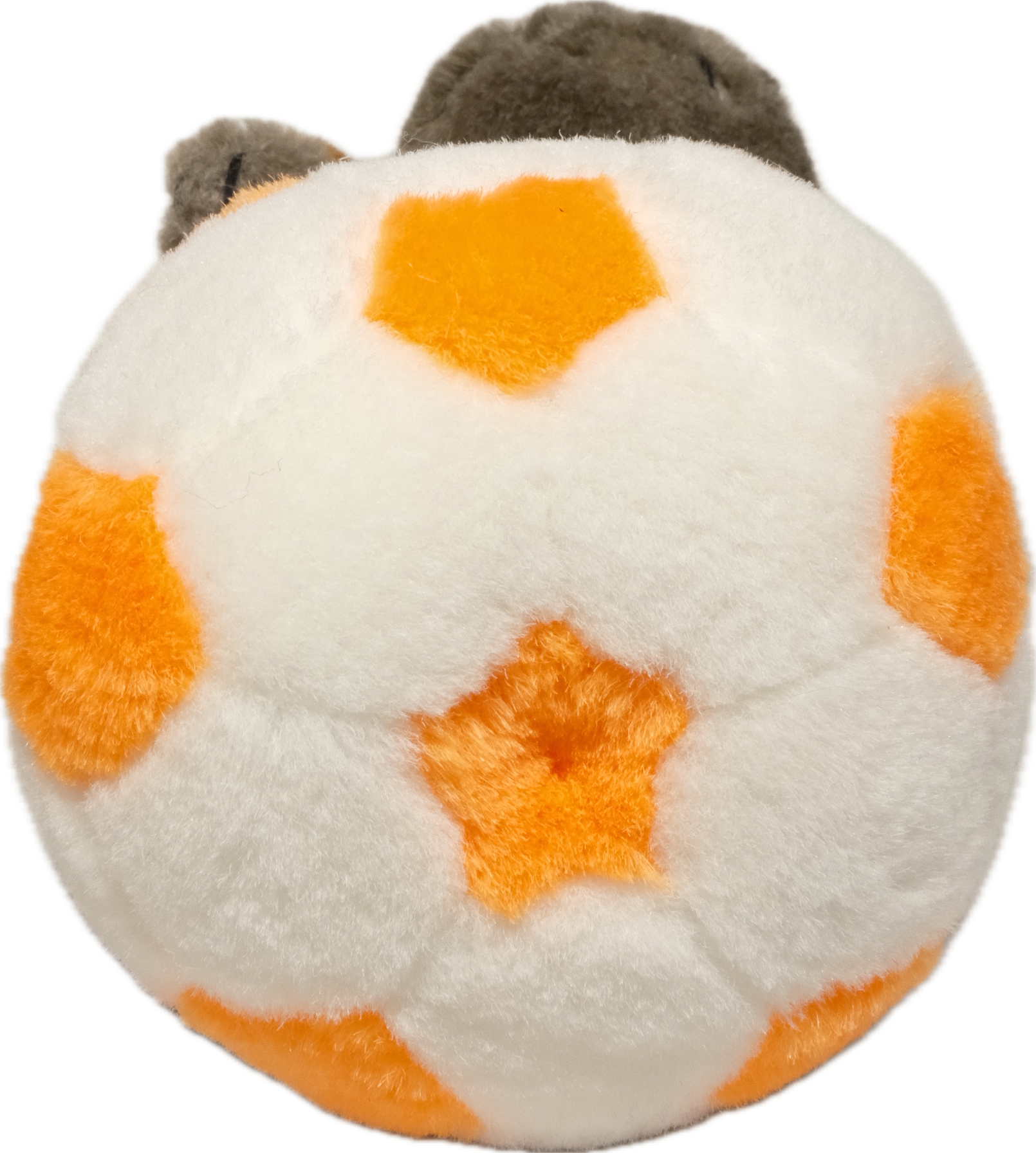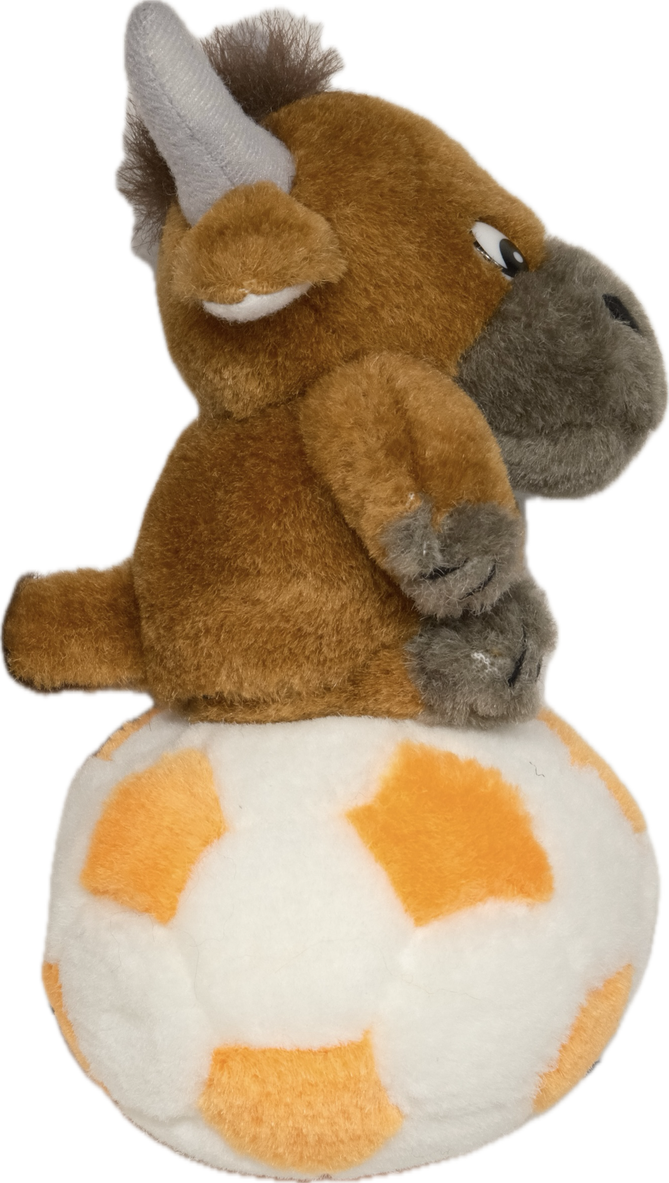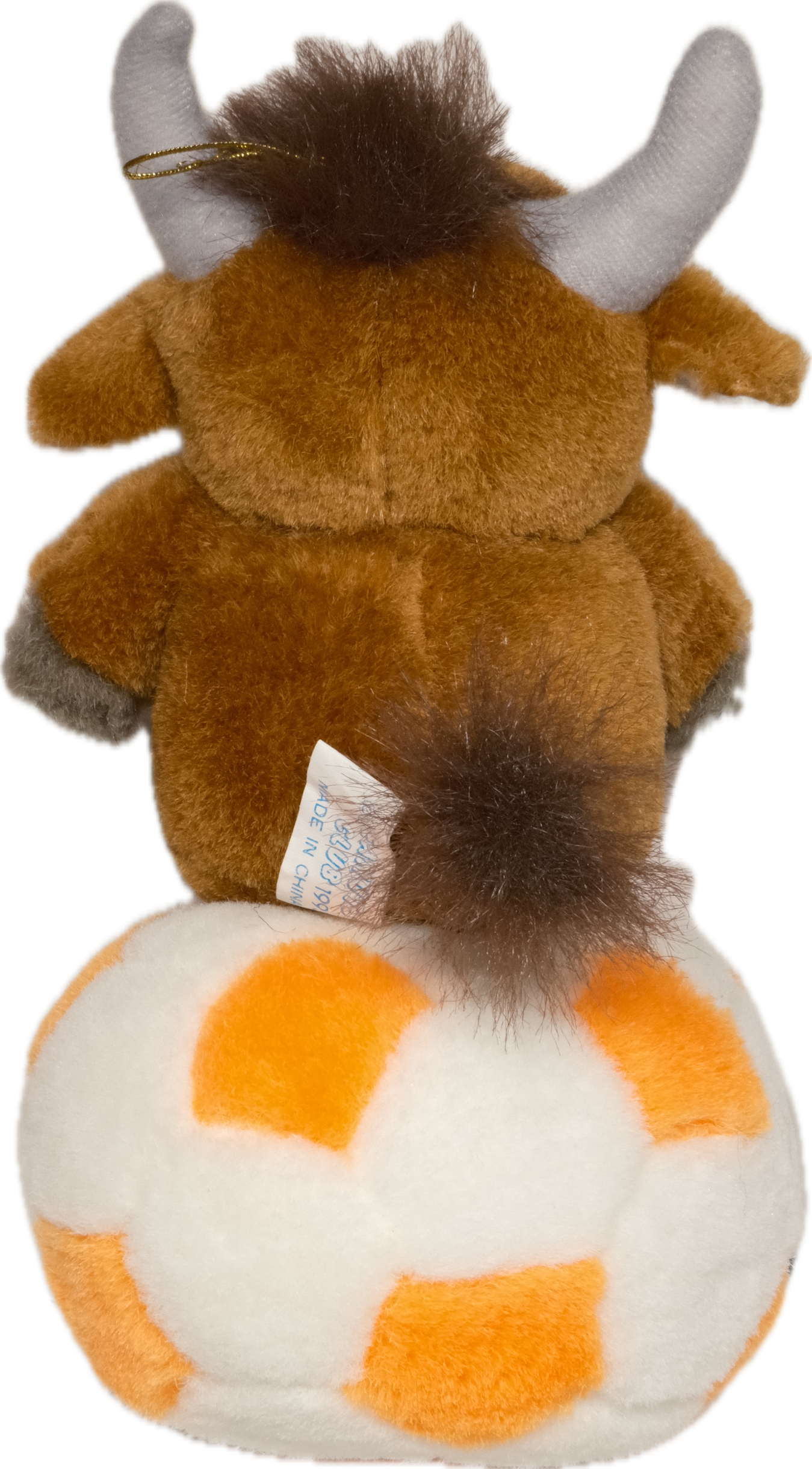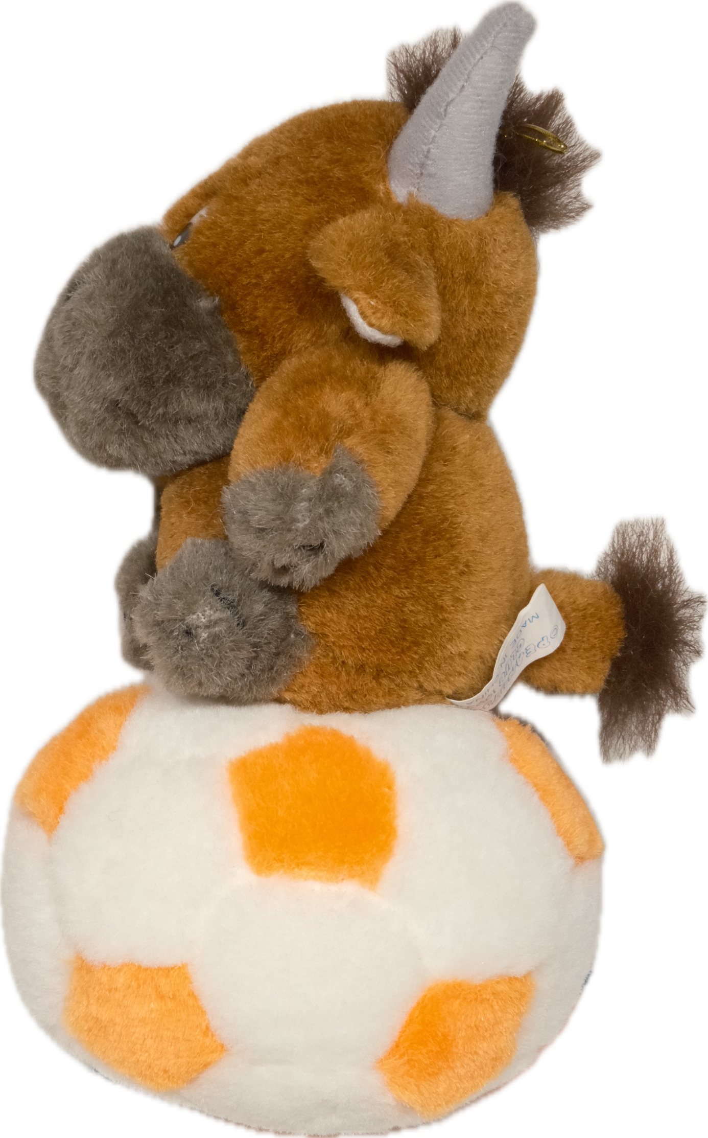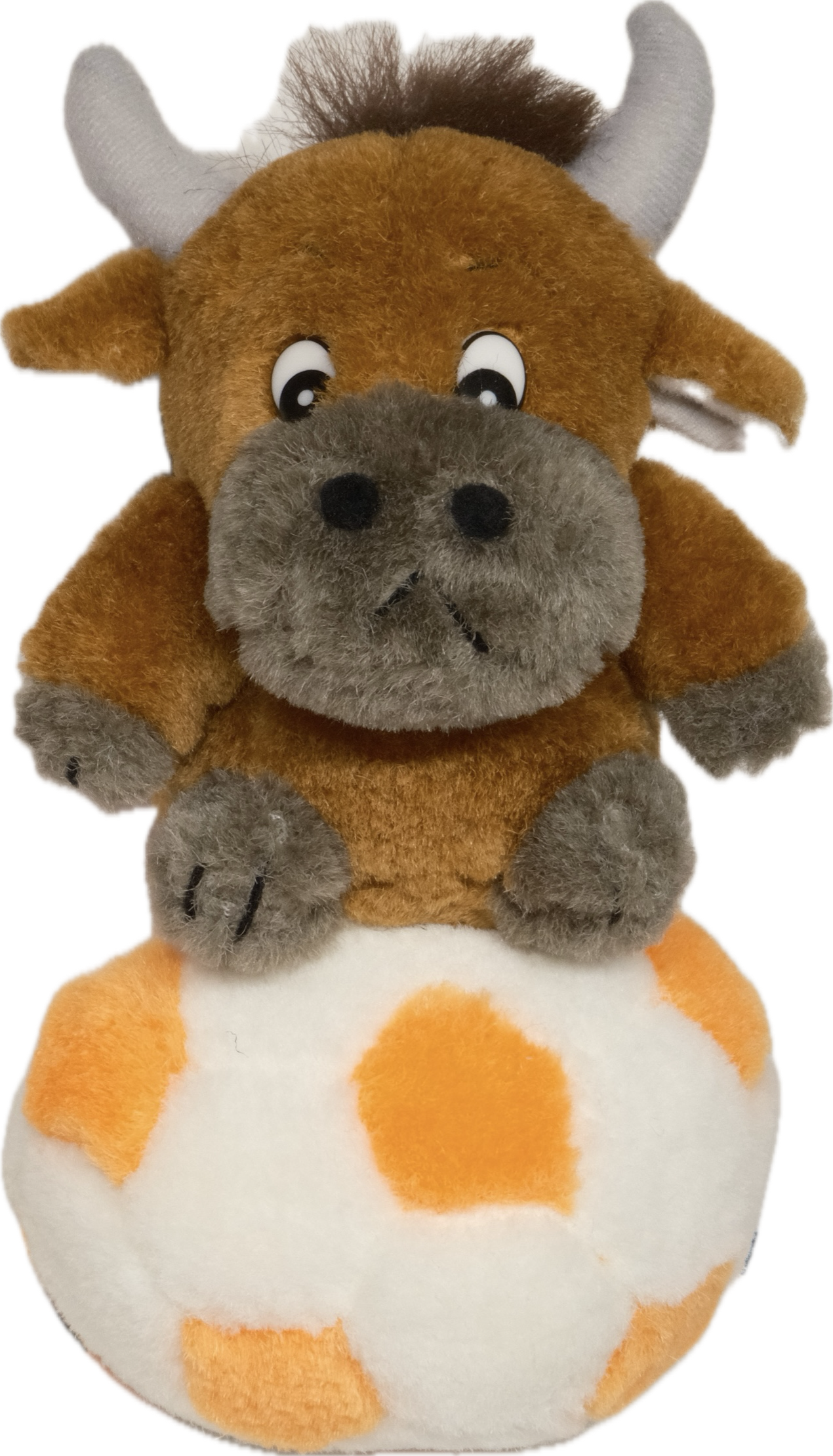 そこそこ古い、ボールに乗った牛のぬいぐるみです。
